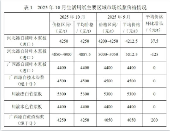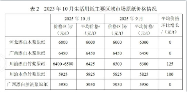 2025年10月,川渝漂白竹浆原纸、川渝本色竹浆原纸平均价格上涨。其余生活用纸主要区域市场原纸平均价格保持稳定,均与9月一致。